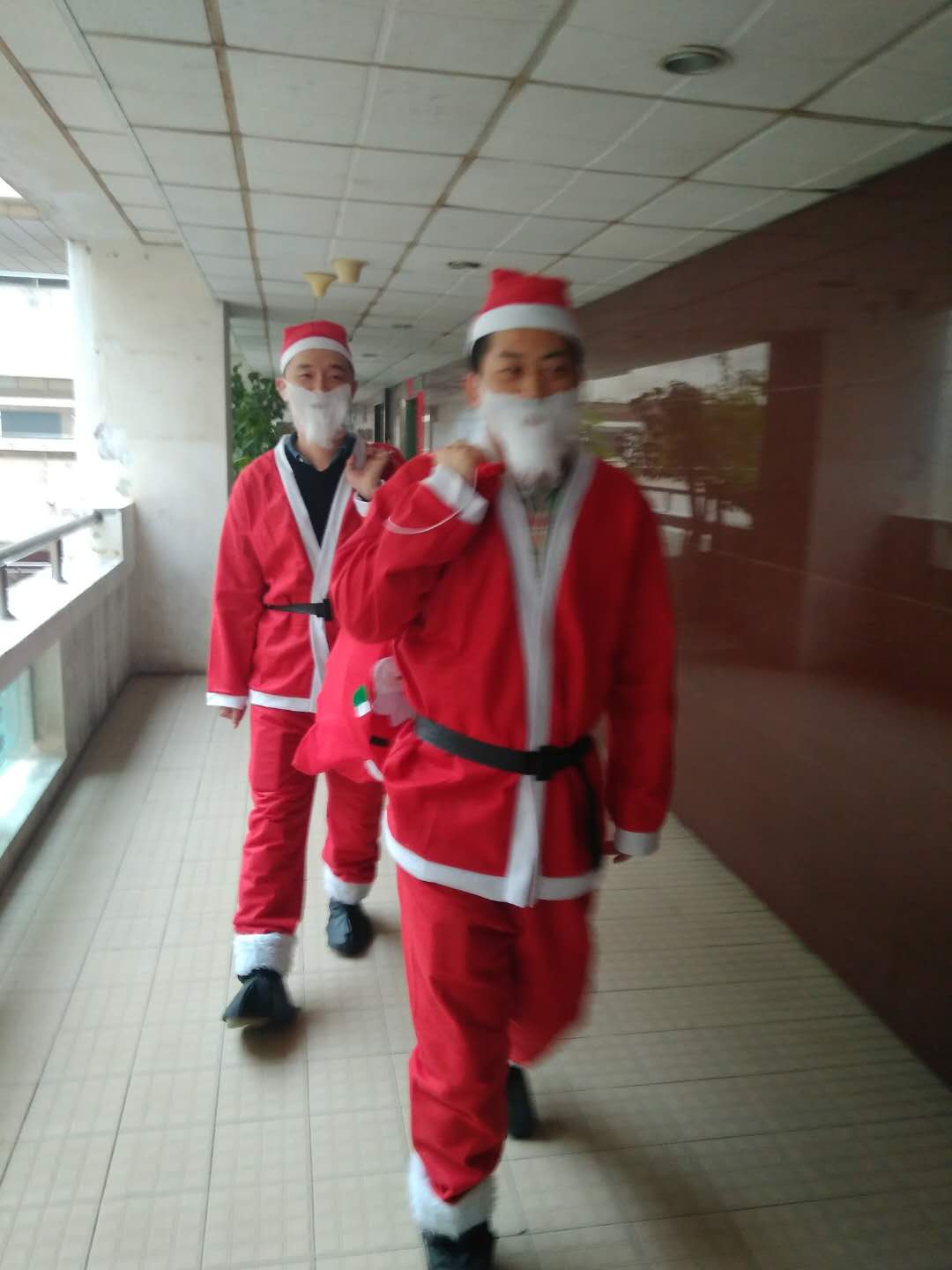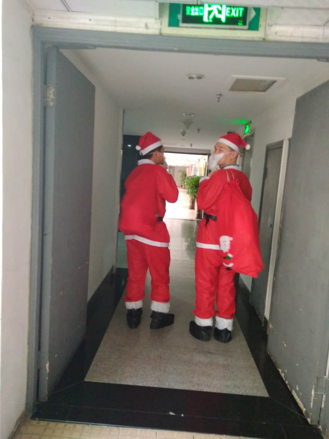 圣诞老人到另外一个楼层给同事们送礼物,这装扮走路都带风,路过其他公司还以为是要给他们送。